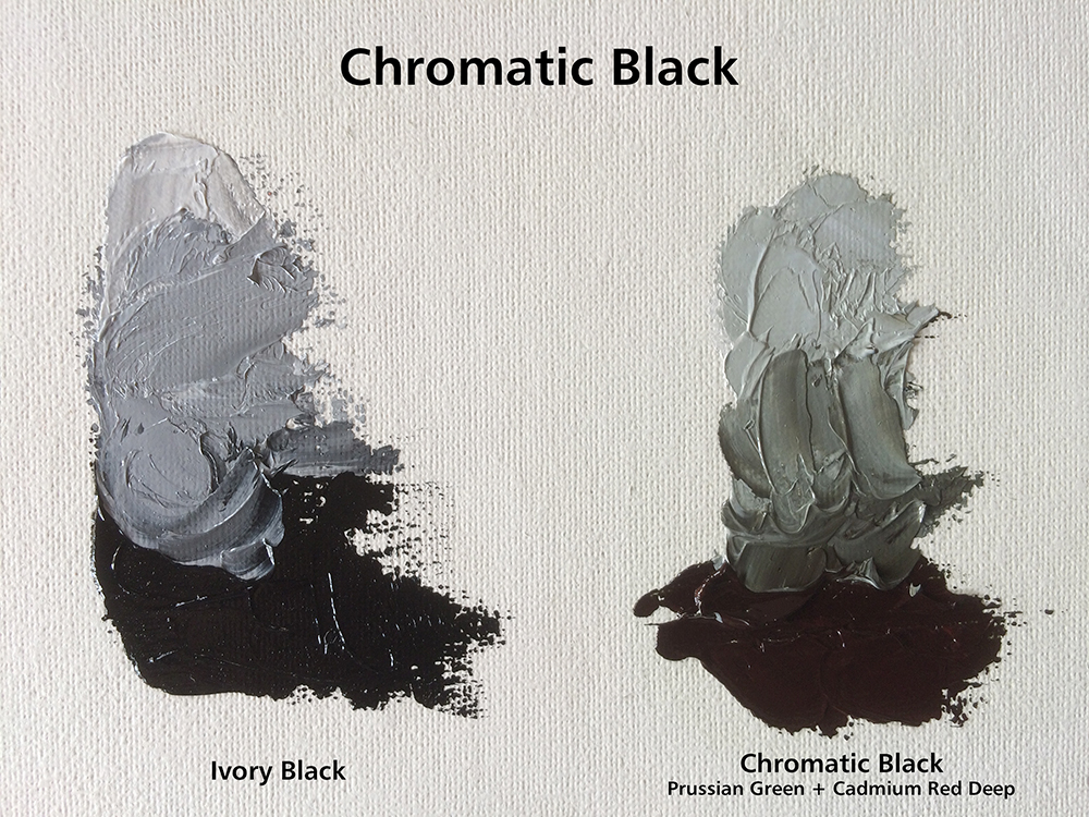 Impressionist painters avoided using straight black in the shadow and dark areas of their paintings because straight-from-the-tube black is a rather lifeless color. They chose instead to use chromatic blacks (a.k.a. mixed black), which usually don’t contain any black pigment. They are mixed either on the palette or in advance from two or three complimentary colors: a dark green and a dark red, or a dark blue + dark red + earth color (a brown). Chromatic black provides the needed dark value while being a more interesting color. Chromatic blacks can be warm, cool or neutral, depending on how they’re mixed.