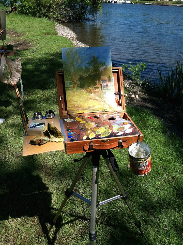 En plein air is a French expression which means “in the open air” and is generally used to refer to the act of painting outdoors, It is also called peinture sur le motif (“painting on the ground”) in French. Typically, the painting is done on site, often in one session and depicts the artist’s view from the easel.